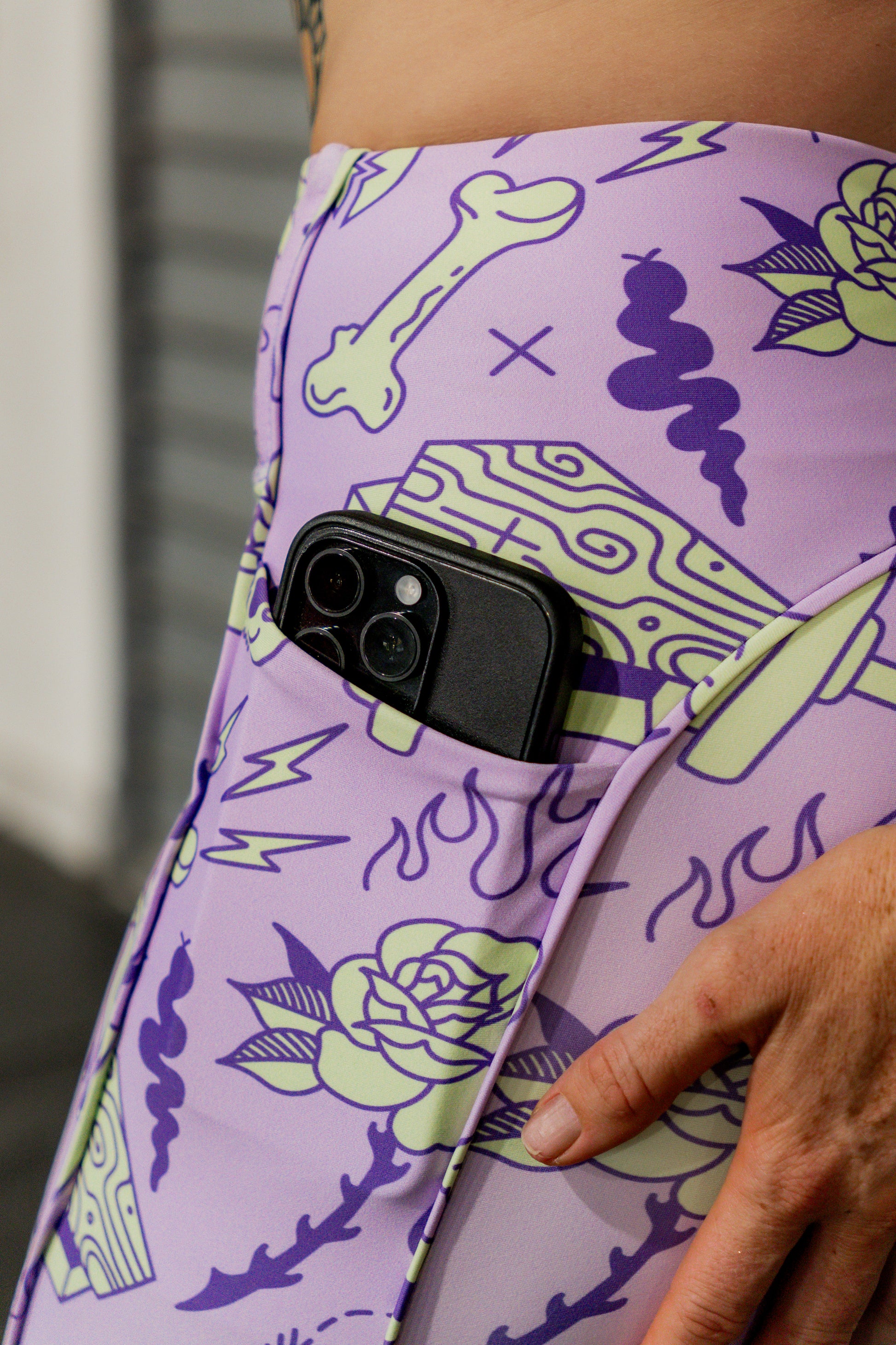 Sculpted to move. These no-front seam shorts offer a sleek silhouette with a contour back panel that enhances your shape. Side pockets add functionality without compromising style. The Barbells & Bones print brings edge to your gym game. Available in Purple Voltage or Pink Riot.